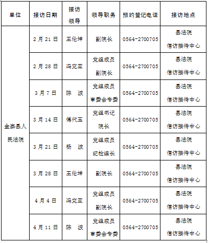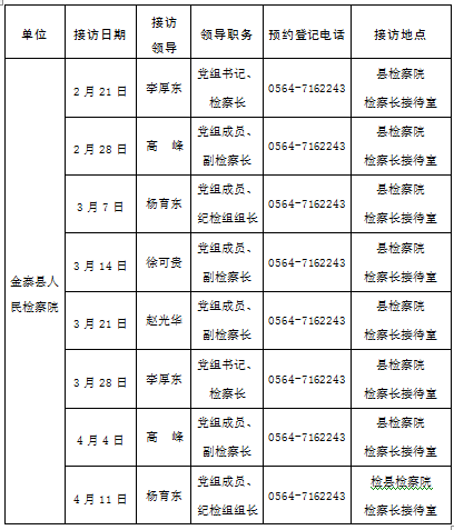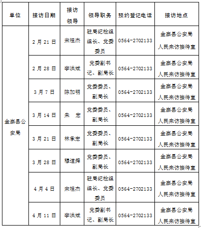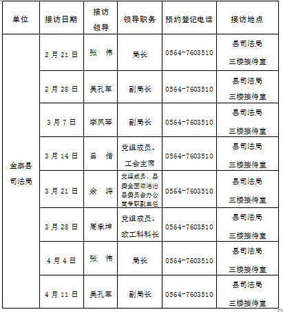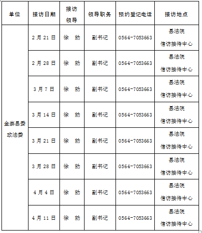 为深入贯彻省委、市委、县委“一改两为”会议精神,切实改进工作作风,持续深化为民办实事,认真倾听群众诉求,着力解决涉法涉诉信访突出问题,金寨县委政法委、县法院、县检察院、县公安局、县司法局将开展联动接访活动。现将接访安排公告如下,请信访群众根据公示内容提前到相关单位预约登记。 2023年2月21日--2023年4月11日,每周二上午8:30-11:30 2023年2月21日--2023年4月11日(工作日期间)